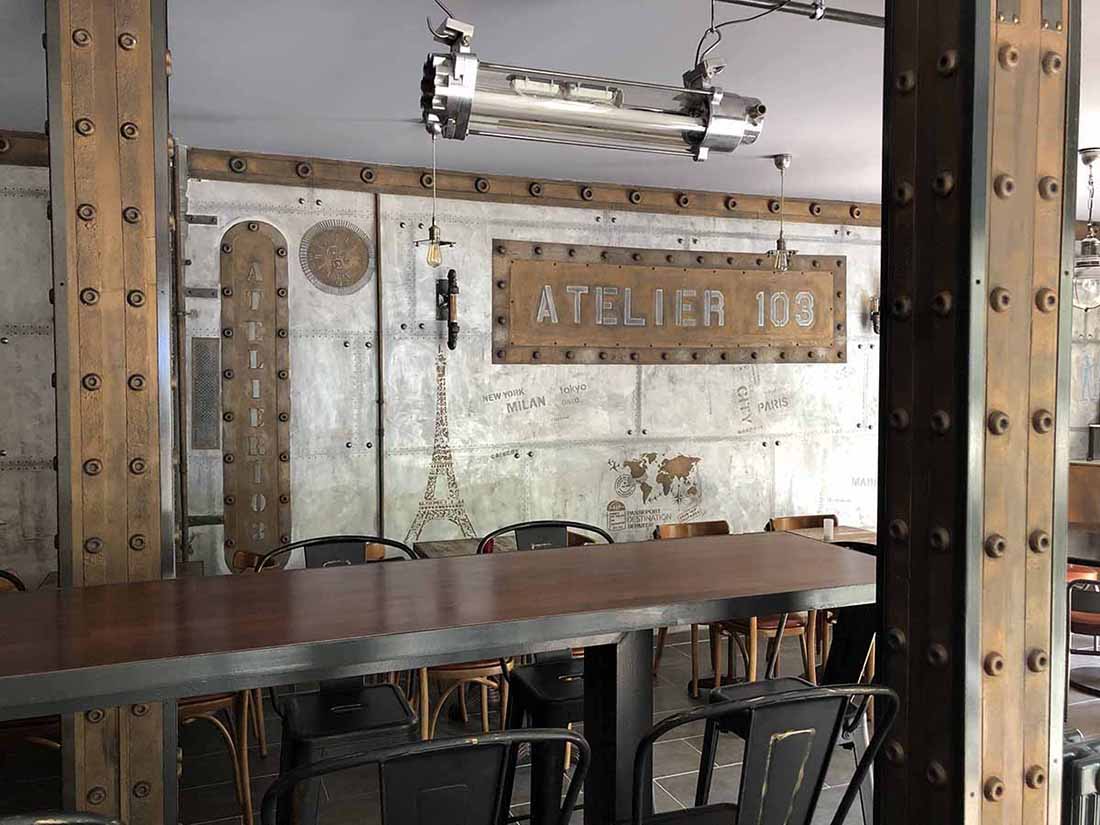 atelier1042 Publié le 23 avril 2019 à 1100 × 825 dans atelier1042 Brasserie murs métal et enseignes en trompe l’oeil sur BA13 et IPN style Eiffel