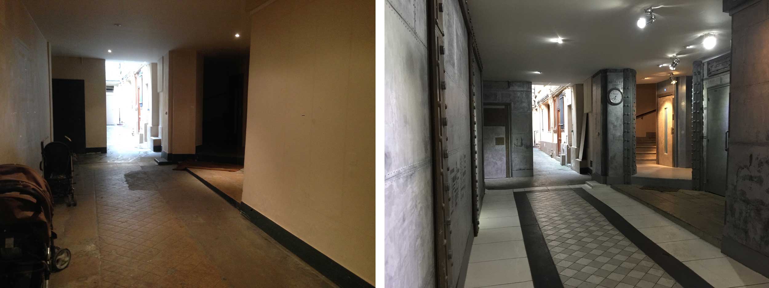 AVANT-APRES Publié le 29 avril 2017 à 2500 × 939 dans AVANT-APRES décoration rénovation hall d’immeuble ancien dans le style industriel