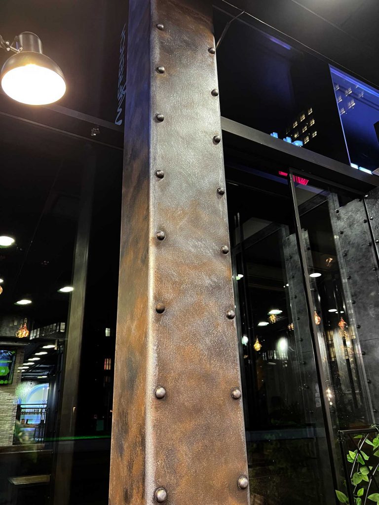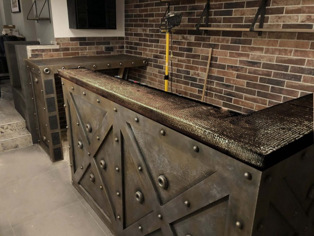 La grande originalité pour une décoration bistrot style industriel c’est de composer d’abord des murs métal 3D rivetés et boulonnés.