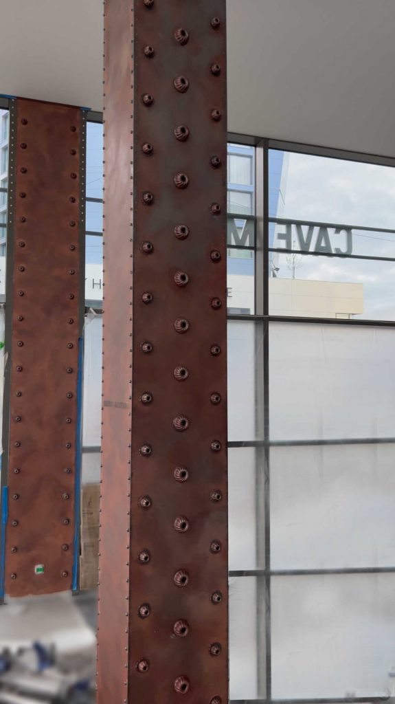 Tout l’intérêt du mur métal style indus est de le découper en plaques, elles mêmes aussi rivetées et boulonnées.