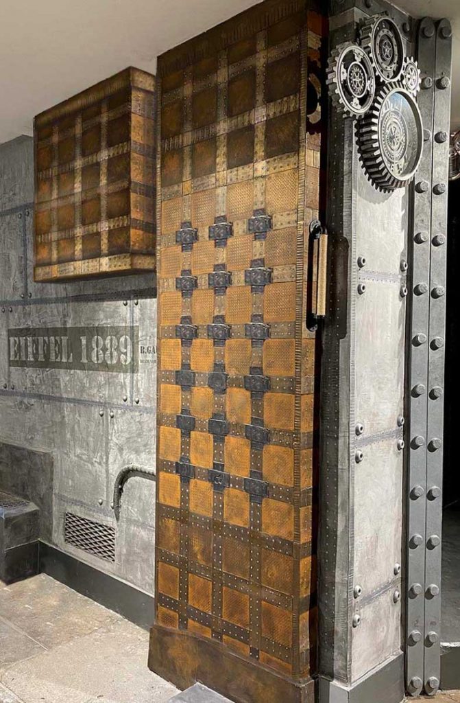 Même si les murs Eiffel à proprement parler n’existent pas, on va faire un rappel des principaux codes qui vont immédiatement l’évoquer, les croisillons métalliques seront créés en sur épaisseurs pour donner son identité.