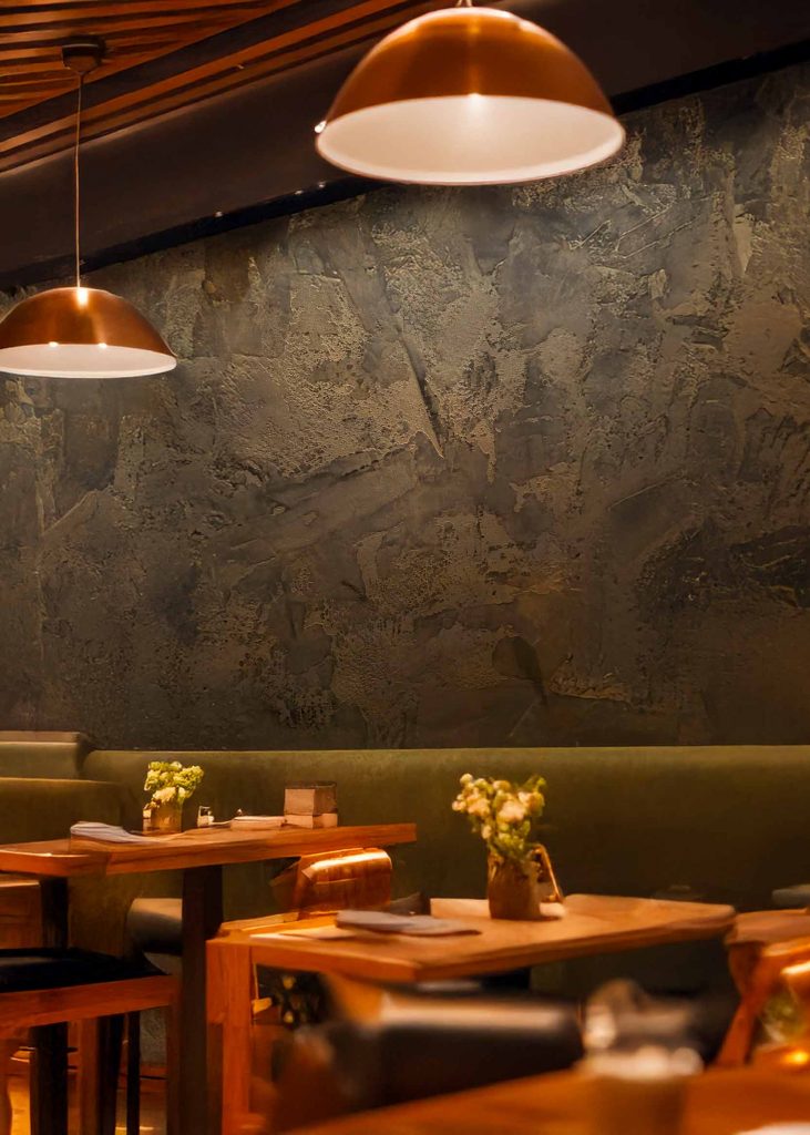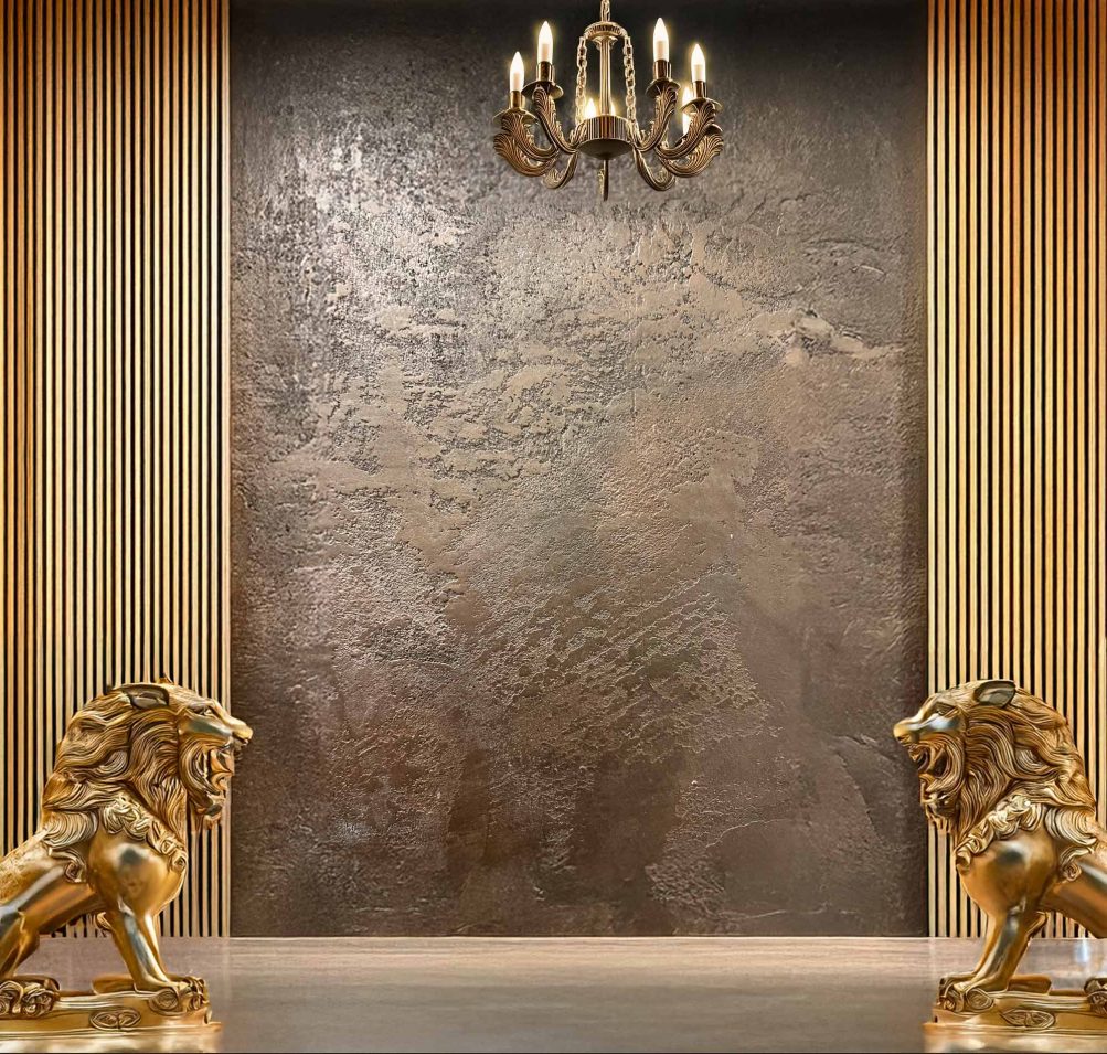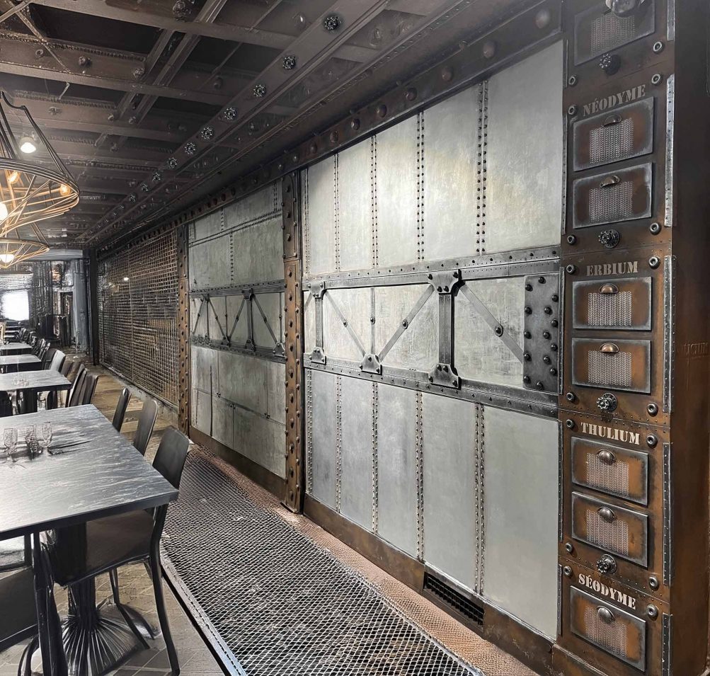 Nous avons aussi mélanger des surfaces travaillées différemment dans un style vintage, oxydé et rouillé en trompe l’oeil.