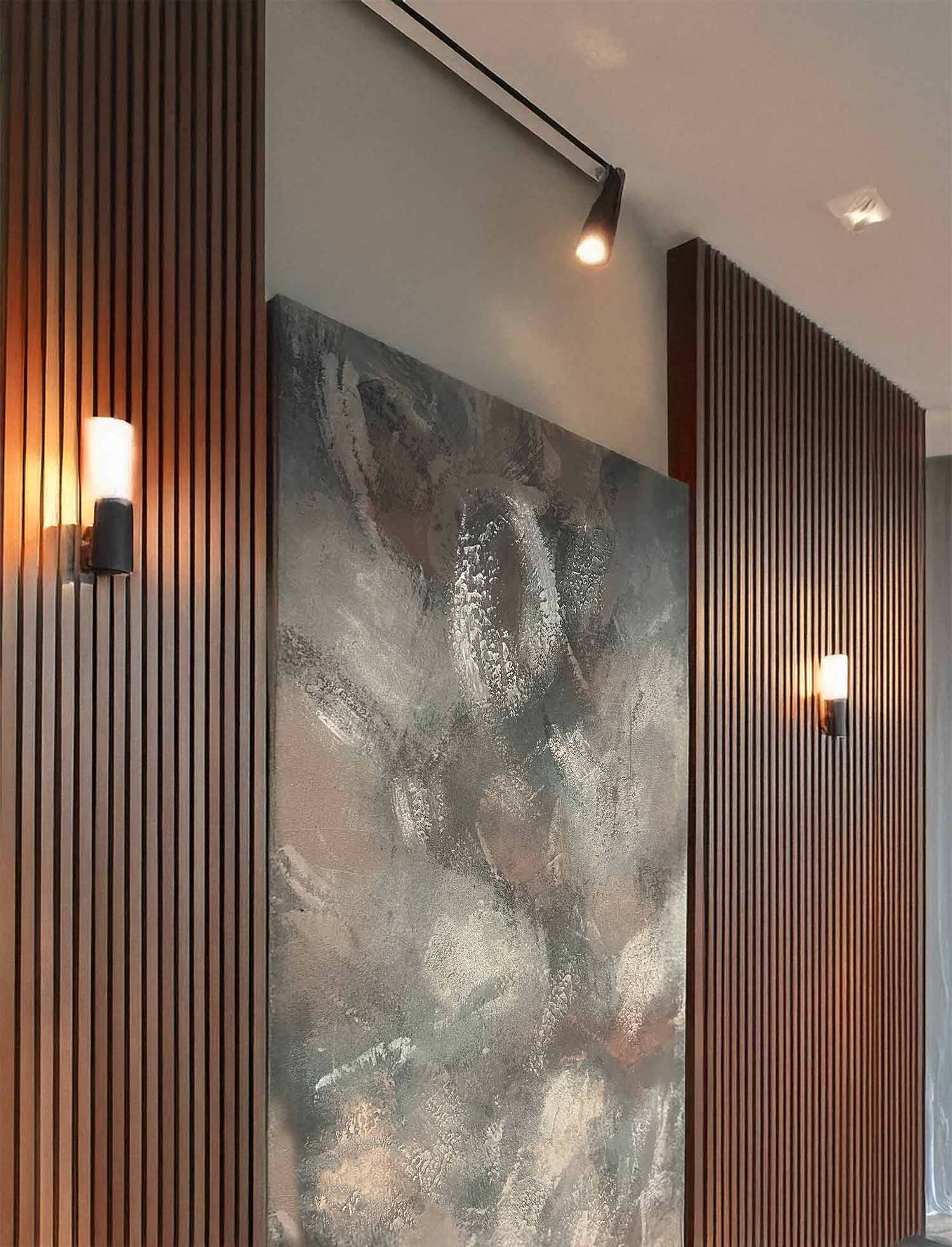 fresque-béton Publié le 3 août 2025 à 1500 × 1964 dans Accueil Fresque travaillée en support poudre de marbre claire et béton minéral foncé, métallisé ensuite sur 4 nuances