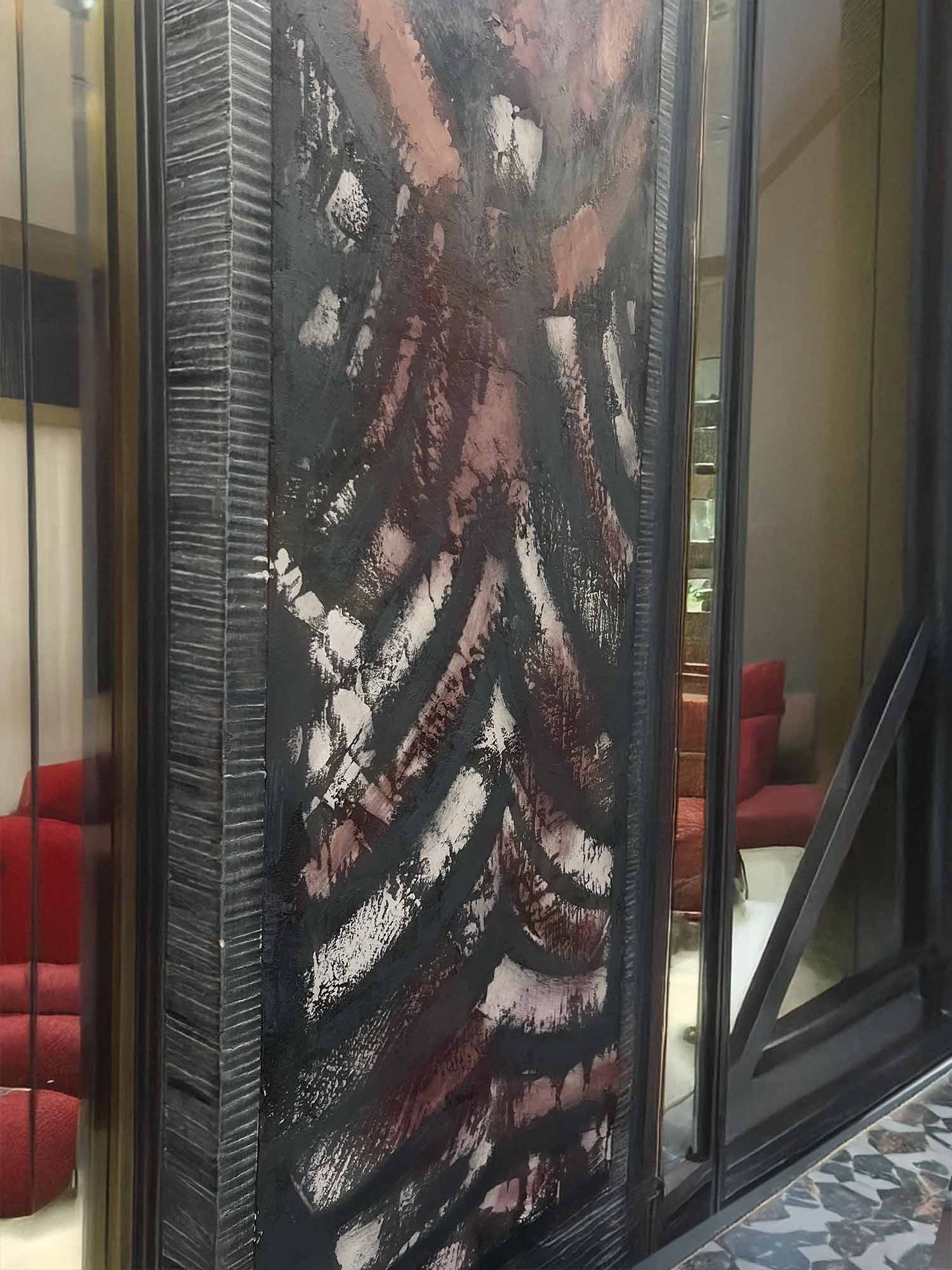 fresquehall Publié le 3 août 2025 à 1500 × 2000 dans Accueil Fresque travaillée en support poudre de marbre claire et béton minéral foncé, métallisé ensuite sur 4 nuances