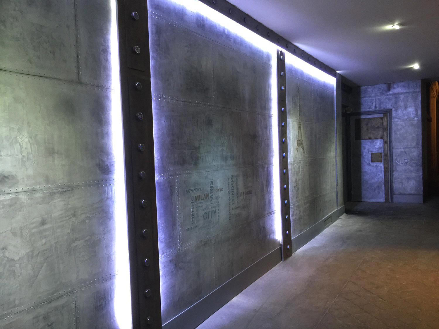 Hall-d’immeuble Publié le 6 décembre 2015 à 1500 × 1125 dans Hall-d’immeuble Mélange Acier, métal oxydé, zinc, le tout éclairé par des leds mur décoration industrielle métal