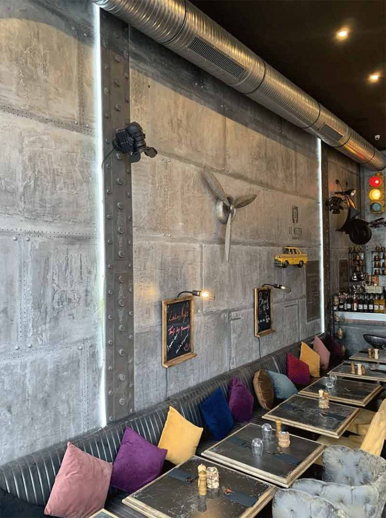 Décoration chic restaurant, les murs métal à l’honneur sur le BA13 et la pierre de taille en trompe l’oeil génial.