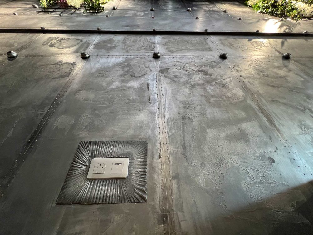 Des murs métal en plaques rivetées et boulonnées à l’ancienne, en trompe l’oeil, mais qui font très largement illusion.