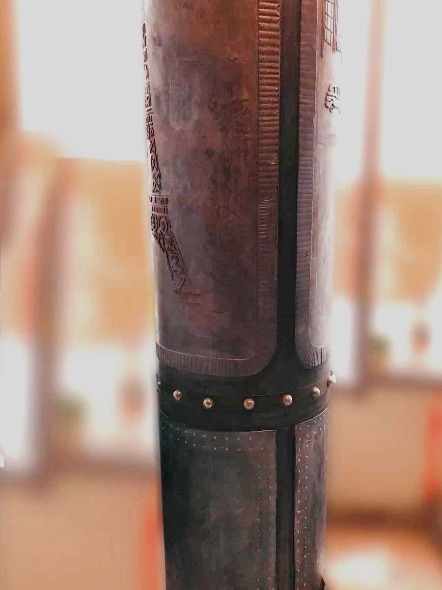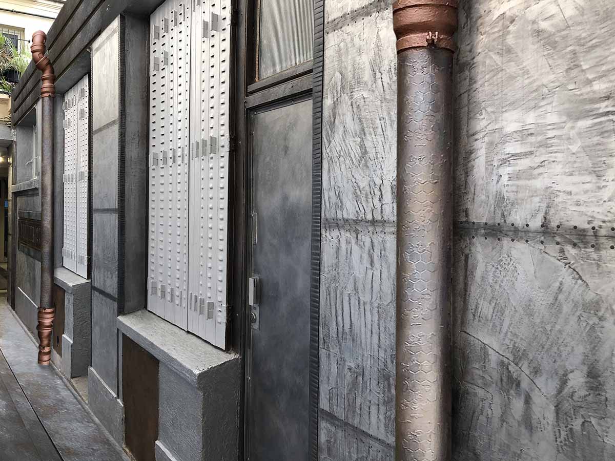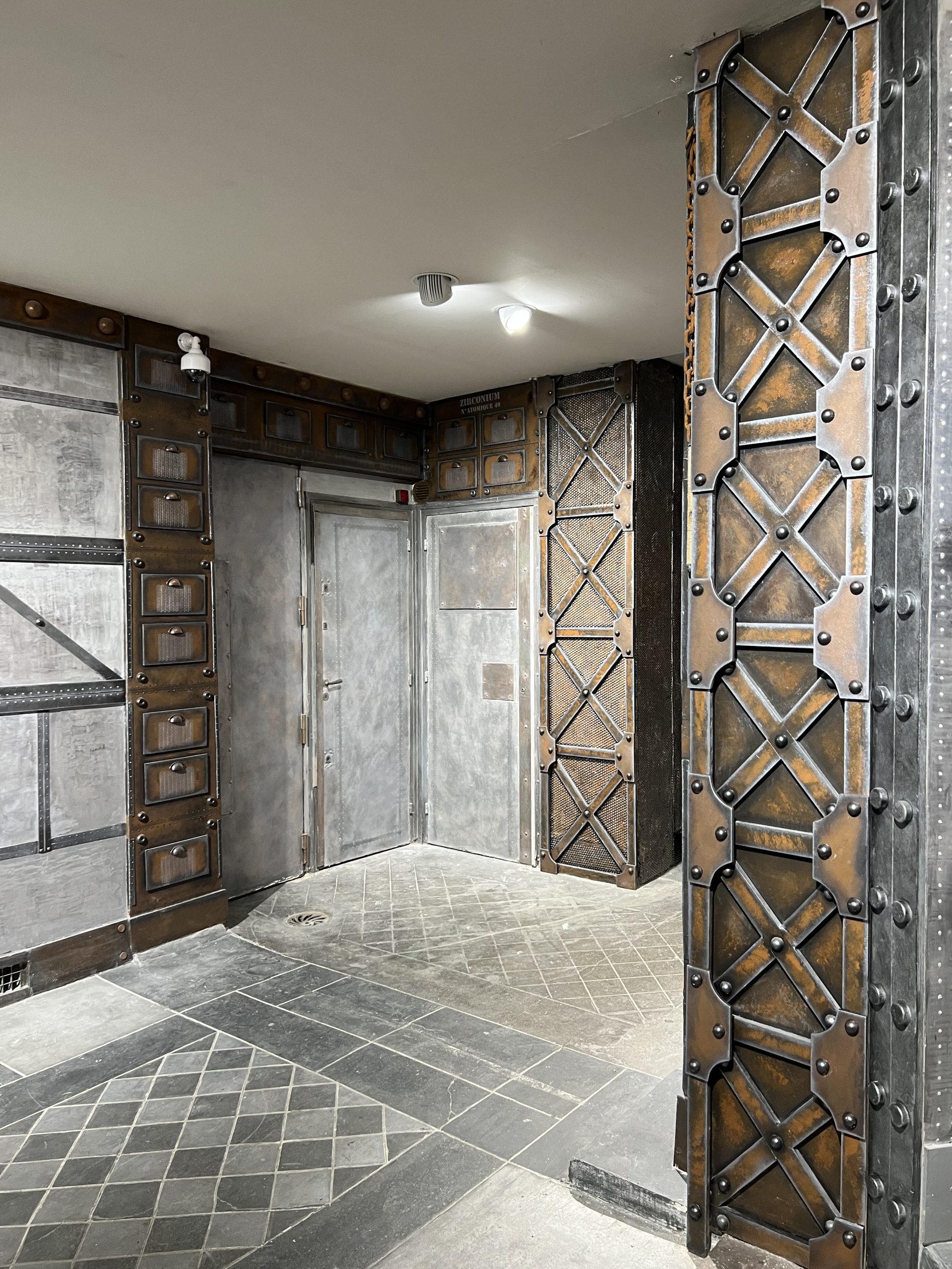 Des murs métal en plaques rivetées et boulonnées à l’ancienne, en trompe l’oeil, mais qui font très largement illusion.