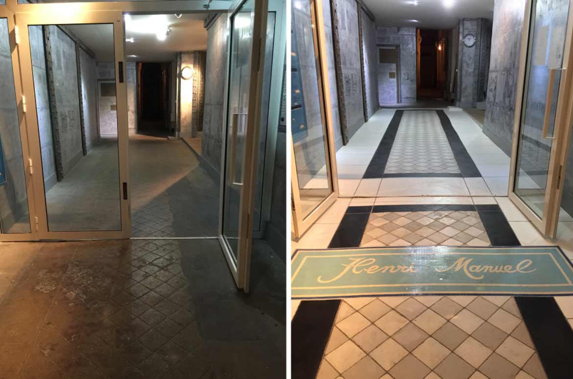 Sol avant après Publié le 21 mars 2017 à 1170 × 773 dans Sol avant après Autre angle sol avant après et carrelage en trompe l’oeil Avant Après juste pour le sol et murs métal rivetés